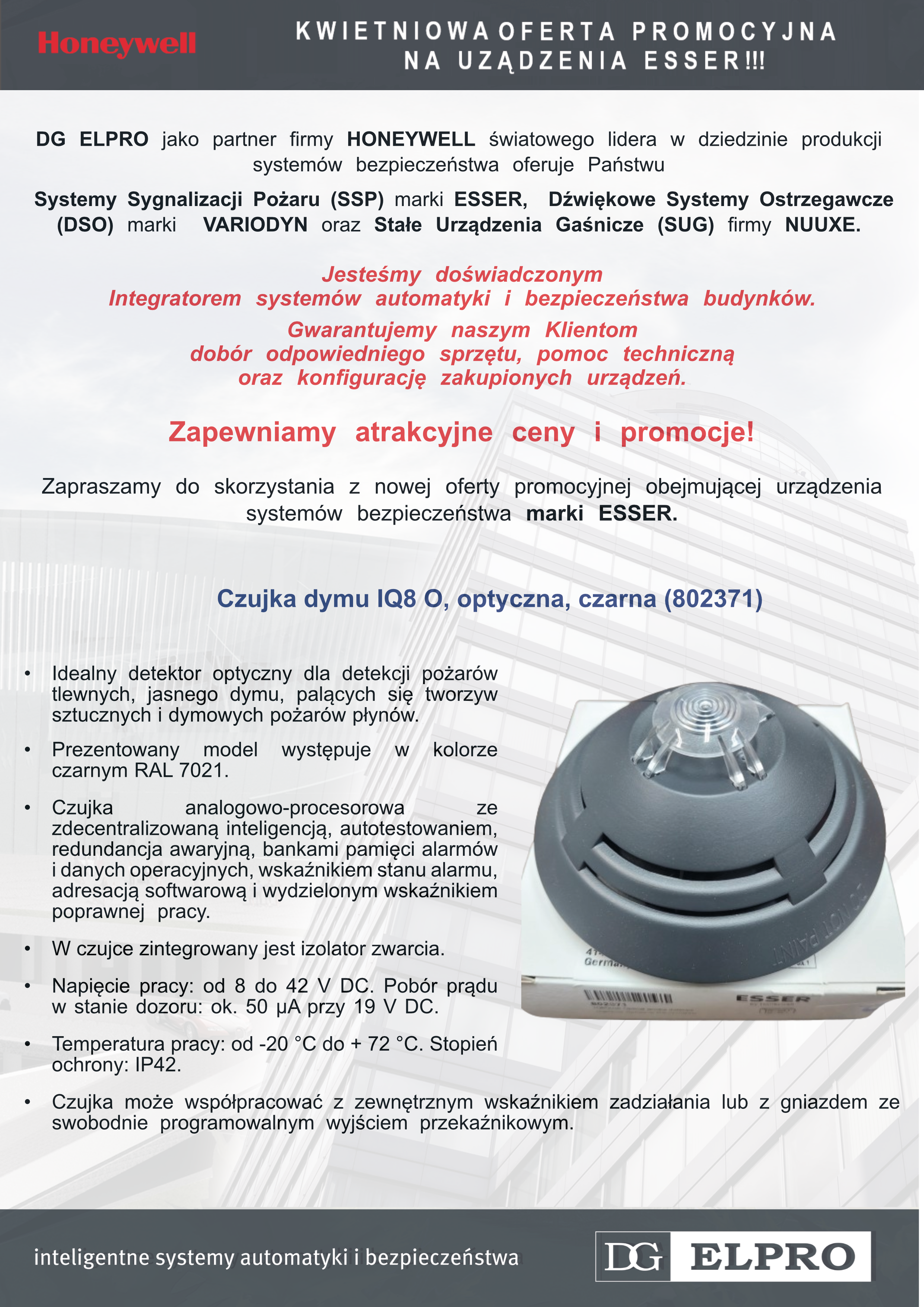 DG ELPRO jako partner firmy HONEYWELL światowego lidera w dziedzinie produkcji systemów bezpieczeństwa oferuje Państwu Systemy Sygnalizacji Pożaru (SSP) marki ESSER, Dźwiękowe Systemy Ostrzegawcze (DSO) marki VARIODYN oraz Stałe Urządzenia Gaśnicze (SUG) firmy NUUXE.
